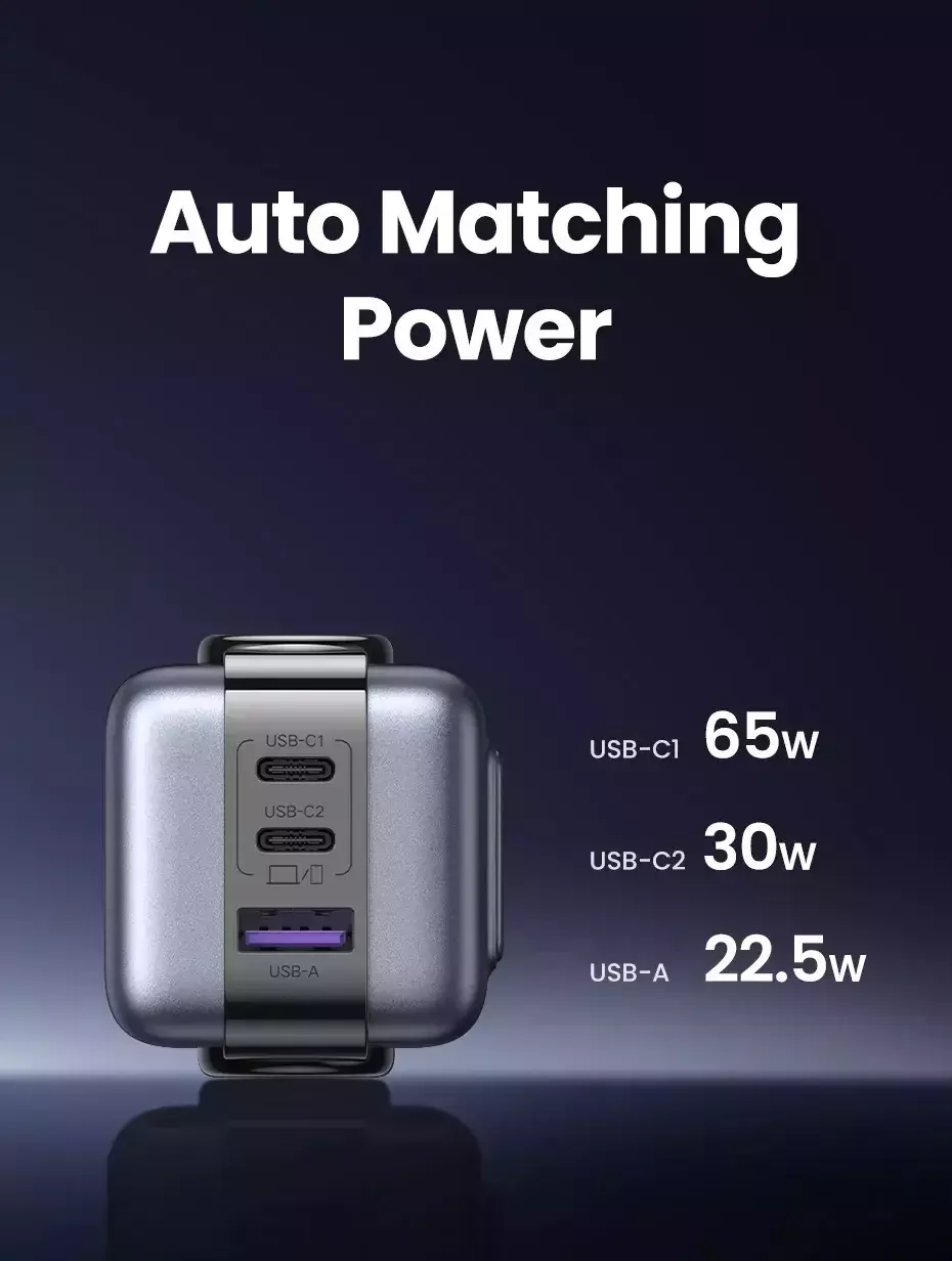 El cargador robot UGREEN NexoDe 65W combina potencia, eficiencia y seguridad en un solo dispositivo, ideal para cargar múltiples dispositivos de manera rápida y confiable. Equipado con 3 puertos (2 USB-C y 1 USB-A), soporta Power Delivery 3.0 y Quick Charge 4.0, adaptando automáticamente la energía según las necesidades de cada dispositivo y optimizando la velocidad de carga sin comprometer la seguridad de la batería.