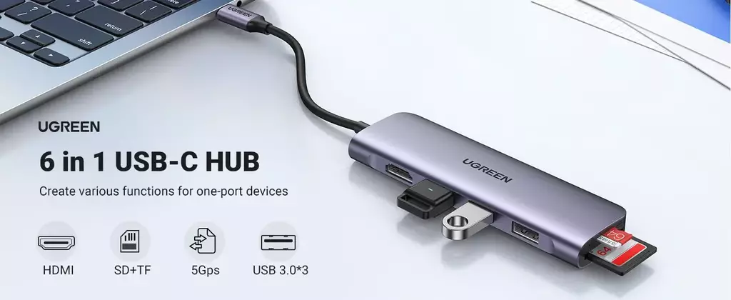 6 en 1 USB-C HUB Adaptador: Amplíe USB-C 3.0 a HDMI 4K@30Hz., SD y TF lector de tarjetas 3*USB 3.0, que es perfecto para MacBook y otros portátil / celular USB-C HDMI 4K Fiesta Visual UHD: El adaptador USB C a HDMI puede disfrutar de una mejor fiesta visual, La resolución de salida HDMI puede alcanzar hasta 4K a 30Hz 5Gbps USB 3.0 & Lector Tarjeta: USB C HUB extienda la portátil / celular a 3 *USB 3.0 y lector de tarjetas SD TF para disco duro, usb memoria, teclado, ratón, pendrive; y disfrutará de una velocidad de transmisión hasta 5Gbps Amplia Compatibilidad: USB C HUB es compatible con los dispositivos que tengan el puerto USB C que soporta la salida de video, tales como Nuevo Macbook M2, MacBook Air/Pro 2022 2021 2020 2019 2018 2017, iMac, iPad mini/air, Galaxy S10 / S9 / S8 Actualización de Producto: El diseño es más delgado y portátil; combina perfectamente con el diseño y el color de su Macbook Pro/Air, práctico y conveniente con una excelente calidad